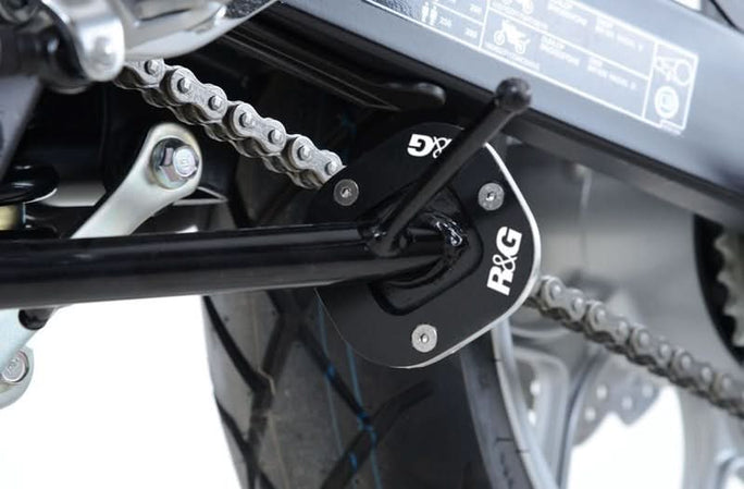 Poszerzenie stopki bocznej R&G Kickstand Shoe zwiększa powierzchnię dolnej części stopki. Dzięki temu motocykl stoi stabilnie na miękkim, a nawet sypkim podłożu – rozgrzanym asfalcie, trawie, ziemi itp. Dolna część poszerzenia wykonana jest z aluminium, co zapobiega korozji po kontakcie z podłożem. Górną wykonano ze stali nierdzewnej. Szybki montaż za pomocą kilku śrub. Zamontowane poszerzenie stopki nie zmniejsza prześwitu pod motocyklem i nie styka się z pracującym łańcuchem napędowym.