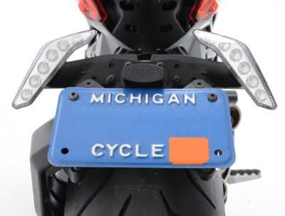 Akcesoryjny uchwyt tablicy rejestracyjnej R&G Fender Eliminator pozwala zrezygnować z fabrycznego, masywnego tylnego błotnika, co mocno poprawia wygląd maszyny. Uchwyt wykonany jest ze stali nierdzewnej i/lub aluminium i malowany proszkowo. Pozwala na zamontowanie tablicy rejestracyjnej blisko ogona motocykla, nadając mu lekką, minimalistyczną linię. W komplecie homologowane oświetlenie LED. Uchwyty R&G Fender Eliminator przeznaczone są do użytku w krajach, w których stosuje się małe tablice rejestracyjne – np. w Wielkiej Brytanii (18 cm wysokości). Dają możliwość montażu oryginalnych lub akcesoryjnych kierunkowskazów. Kolor: czarny.